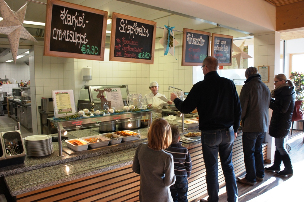 Eine äußerst raffinierte Taktik, die der Biohof Achleitner da verfolgt: Direkt hinter der Obstabteilung mit frischen Äpfeln, Lauch und Melanzani verströmt eine offene Schauküche ihren betörenden Duft. Genieß ich die Köstlichkeiten gleich hier im Kulinarium des Bio-Supermarkts oder koch ich sie daheim nach, grübelt der Kopf. Am besten beides, jubelt der Bauch: Jeden Tag lockt ein anderes Mittagsgericht sowie ein vegetarisches, oft sogar veganes Buffet mit Ratatouille, Süßkartoffeleintopf, Kürbisrisotto und anderen Spezialitäten der heimischen, mediterranen und fernöstlichen Küche. Wer rechtzeitig aus den Federn kommt, kann bis 11 Uhr bei einem orientalen, Fitness- oder Proseccofrühstück verträumt in die Sonne blinzeln, die zwischen den vielen Grünpflanzen durchblitzt. Naschkatzen erwartet ein süßes Kuchenbuffet, dessen Vielfalt erklärt, warum der Biohof die bezaubernde Adresse „Unterm Regenbogen 1“ hat.