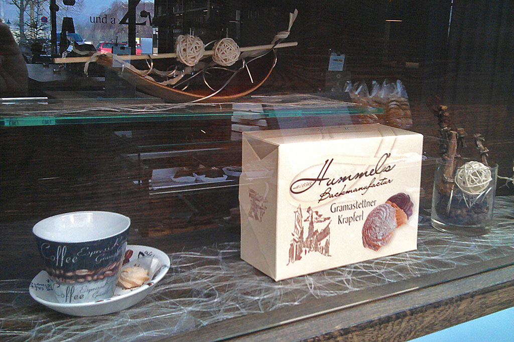 Gramastettner Krapferl begrüßen die Gäste schon an der Ortseinfahrt, und auch in der Dessertvitrine des Restaurants Gramaphon darf das mit Staubzucker bestreute oder halb in Schokolade getunkte Wahrzeichen der Gemeinde nicht fehlen. Nicht nur bei der Wahl der Mehlspeisen erweist Gastronom Johannes Roither der heimischen Küche seinen Respekt: Mühlviertler Saltimbocca, Mostrisotto mit Blunzenradeln und Kartoffel-Gemüselasagne zeugen vom experimentierfreudigen Umgang mit österreichischen und mediterranen Rezepten. Auch bei den Lebensmitteln achtet Roither auf regionale Herkunft: Zu seinen Lieferanten gehören etwa die Speckwerkstatt Haudum aus Helfenberg, die Kaffeerösterei Suchan aus Freistadt sowie Most- und Käsebauern aus der unmittelbaren Umgebung. Das Lokal selbst ist lichtdurchflutet, zugleich sorgen Ziegelmauern, Holztische und dunkelrote Filz- und Ledersessel für eine erdige Note. Entspannt beobachtet man nach dem Essen bei einer Tasse Sonnentor-Tee und einem süßen Mürbteigkrapferl das gemächliche Treiben auf dem Marktplatz vor dem Fenster.