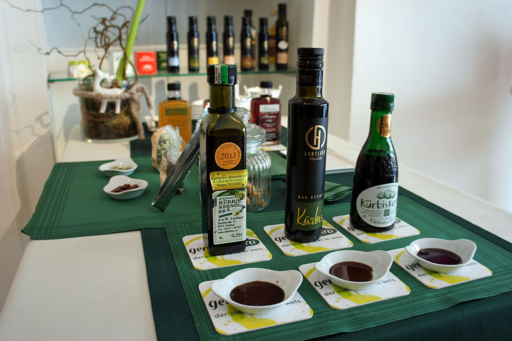Dunkelgrün sind alle drei, aber wo das eine Kürbiskernöl nussig schmeckt, ist das andere mild, das dritte röstig. „Mit dem Öl ist es wie mit dem Wein“, erklärt der „Genuss-Steira“ Manfred Reisinger bei der Verkostung: „Der Boden, das Klima und die sorgfältige Verarbeitung entlocken derselben Kürbissorte unterschiedliche Aromen.“ Deshalb achtet der gebürtige Steirer in seinem Geschäft am Welser Stadtplatz so genau auf die Herkunft der Ware: Für die Schmankerl reist er regelmäßig in seine Heimat, um die Herstellerinnen und Hersteller persönlich kennenzulernen und ihre Produkte zu probieren. Bei den Edelbränden von Tinnauer, den kreativen Senf-Variationen von Fischerauer, den Chutneys und Essigen von Weinstock oder dem Bio-Wein von Hagen schmeckt man noch richtig die Liebe und die Leidenschaft, ist Reisinger überzeugt. „Mir geht es nicht um große Namen“, erklärt der Steirer, „sondern um die Qualität, um handwerkliches Können und darum, dass die Betriebe so naturnah wie möglich arbeiten.“