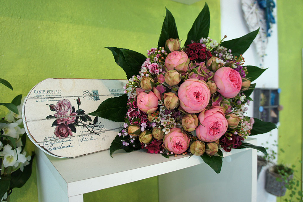 Der Strauß in zarten Rosatönen sieht nicht nur zum Anbeißen aus: „Die ungespritzten Bio-Edelrosen aus Freistadt kann man tatsächlich essen“, lacht Andrea Hirsch. Seit bald fünf Jahren ist ihr Geschäft Hirsch trifft Blume ein heißer Geheimtipp für blütenprächtige Dekorationen. Besonders bei Trauungen nimmt sie sich Zeit, um mit viel Liebe zum Detail auf individuelle Wünsche einzugehen: So gestaltet sie für eine Meereshochzeit einen Brautstrauß aus Muscheln und Wasserblumen oder für eine Feier im Stil der 20er Jahre ein Bouquet aus traditionellen Wicken, Freesien und Frauenmantel. Die Blumen, Moospolster und Wurzelstöcke für ihre Kreationen bekommt sie großteils von kleinen Gärtnereien und Bauernhöfen aus der Umgebung, und auch bei den charmanten Mitbringseln wie Kugelfröschen, Weinflaschen oder Grünkohl-Pesto achtet sie auf regionale Herkunft. Zudem bastelt die Floristin herzige Grußkarten aus handgeschöpftem Papier, die eine blühende Überraschung bergen: Vergräbt man die Billets in der Erde, sprießen blumige Liebesboten aus den im Karton versteckten Samen.