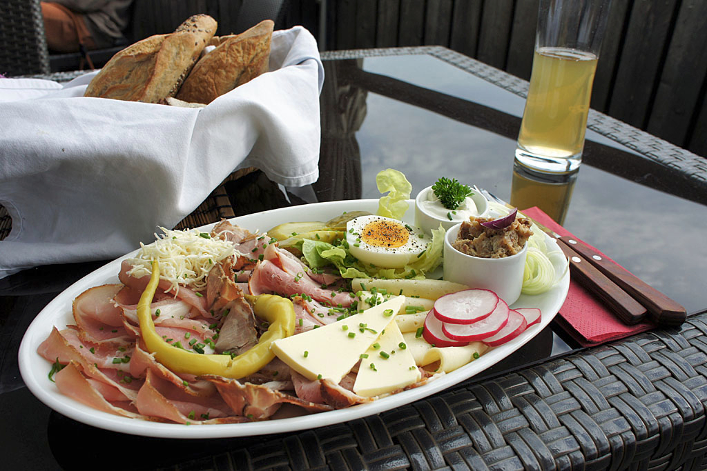 Am Ast eines Apfelbaums hängt die Schaukel mit dem vermutlich besten Ausblick auf das Eferdinger Becken: Umgeben von blühenden Streuobstwiesen ist der Köglerhof in Gramastetten ein beliebte Anlaufstelle für hungrige Wandersleute, die nach einer Tour auf den 690 Meter hohen Koglerauer Spitz bei einer zünftigen Jause auf der sonnenverwöhnten Terrasse frische Kräfte tanken. Brot, Speck und Topfenaufstriche stammen allesamt aus dem Mühlviertel, der Großteil sogar aus der hauseigenen Bio-Landwirtschaft, wo neugierige Fleckviehrinder, seltene Brillenschafe und schreckhafte Wildhühner unter freiem Himmel grasen. Aus Milch, Eiern und Fleisch produziert die Familie Bauernfeind „Lebensmittel, wie man sie von früher kennt“. Dazu gibt es preisgekrönten Most und naturtrüben Apfelsaft aus dem Obstgarten sowie eine breite Auswahl an Mühlviertler Bio-Bieren. Jeden Freitagnachmittag öffnet der Hofladen seine Pforten, wo man sich mit den naturbelassenen Köstlichkeiten als Wegzehrung für die nächste Wanderung eindecken kann.