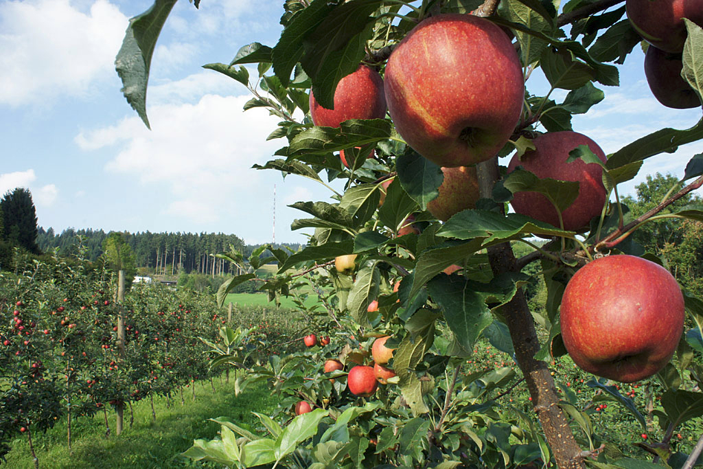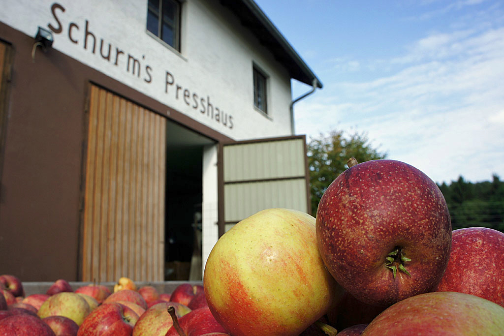 Die allererste Ernte waren die skeptischen Blicke der Nachbarn: „Wir sind die einzigen weit und breit, die auf 780 Metern Höhe Obst anbauen“, sagt Martin Schurm nicht ohne Stolz. Anfangs wollte niemand glauben, dass das auch tatsächlich funktionieren kann, doch mittlerweile heimst der Familienbetrieb am Hang des Lichtenbergs eine Auszeichnung nach der anderen ein. Die preisgekrönten Fruchtsäfte, Moste, Schnäpse und Cider entstehen allesamt im Presshaus, wo Äpfel und Birnen schonend gepresst, mit natürlichen Methoden haltbar gemacht und in Pfandflaschen abgefüllt werden. Zu kaufen gibt es die süßen und herben Tropfen unter anderem direkt vor Ort: Im ehemaligen Kuhstall warten neben den hofeigenen Produkten noch einige „ausgefallene Sachen, die du so im Geschäft nicht kriegst“, verweist Silvia Schurm auf die vollen Holzregale. Von befreundeten Betrieben aus der Umgebung bezieht sie Käse von Kuh oder Ziege, kerniges Bauernbrot, Eiernudeln und Bio-Pestos, damit die Kundinnen und Kunden „nicht alle einzeln abklappern müssen“ und dennoch die Geschmacksvielfalt der Region auskosten können.
