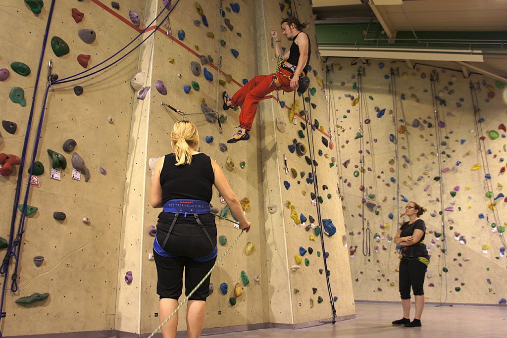 Damit das Tohuwabohu im Hirn endlich mal zur Ruhe kommt, muss man sich nicht unbedingt im Lotussitz auf die Yogamatte werfen: Klettern ist für Susanne Ohlenschläger pure Meditation, „weil du voll konzentriert sein musst und nur an den nächsten Griff denkst“. Als kleiner Bonus wird zudem „von den Zehen bis zu den Fingerspitzen jeder Muskel beansprucht“, fügt die Übungsleiterin und Geschäftsführerin der Naturfreunde-Kletterhalle in Linz-Auwiesen lachend hinzu. In Schnupperstunden und Grundkursen lernt man die nötige Technik, ehe man sich allein oder zu zweit an die mehr als 500 unterschiedlich schwierigen Routen wagt. Obwohl am Wochenende manchmal bis zu 300 Leute durch die größte Kletterhalle Österreichs kraxeln, genießen sie immer noch volle Bewegungsfreiheit, scherzt Ohlenschläger: „Bei uns muss man nicht ständig ängstlich nach oben schauen, ob drüber grad wer runterfliegt.“