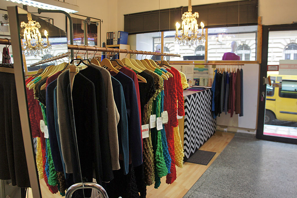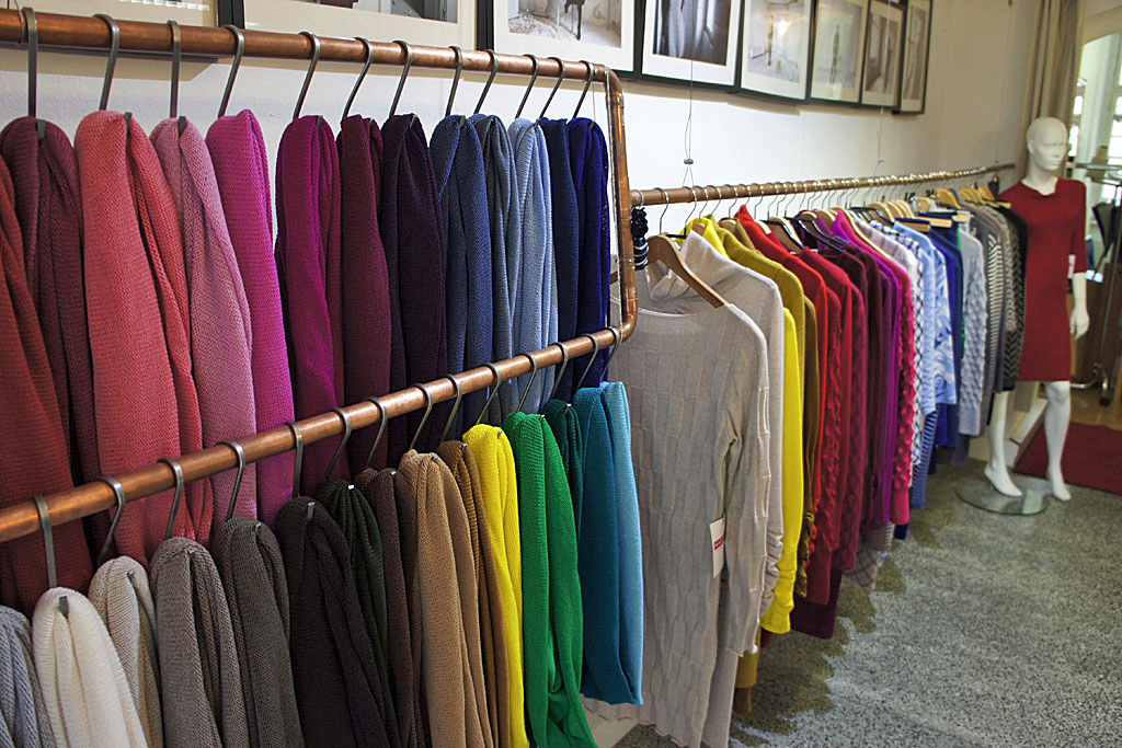 Geschäftig rattert das Schiffchen über den Nadelkamm, sodass Zeile um Zeile die dreidimensionale Struktur des Stofffleckerls zutage tritt. „Das ist besser als Fernsehen, da könnte man stundenlang zuschauen“, scherzt Christina Huber, die gemeinsam mit Fritz Prunthaller vor mehr als zehn Jahren das Modelabel Masi gegründet hat. Direkt hinter dem Verkaufsraum nahe des Linzer Doms stehen die zwei eineinhalb Tonnen schweren Strickmaschinen, mit denen die beiden aus teils Bio- und GOTS-zertifizierten Merino- und Baumwollgarnen ihre langlebigen, farbintensiven Kleider, Pullover und Schals produzieren. Körper, Ärmel und andere Einzelteile werden für die jeweilige Passform maßangefertigt. Daher kann Masi auch auf individuelle Sonderwünsche eingehen, erklärt Huber: „Wenn jemand sagt, er hätte das Modell gern eine Spur länger oder in Grasgrün, dann stricken wir innerhalb von ein paar Wochen ein ganz persönliches Unikat.“ Von der klassischen Weste fürs Büro bis zum figurbetonten Brautkleid war schon alles dabei, erinnert sich Huber. „Und wenn mal was trotzdem nicht passt, produzieren wir dennoch kaum Abfall, weil wir es einfach wieder auftrennen.“