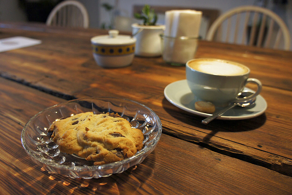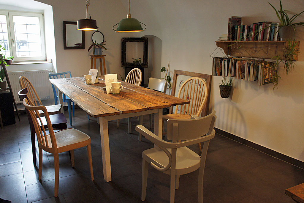 Beglühbirnte Suppentöpfe aus Omas Küchenkastl leuchten auf das fröhlich zusammengewürfelte Sesselsurium, das altersmäßig schon fast mit dem historischen Gewölbe mithalten kann. „Für die Einrichtung haben wir über ein Jahr lang Flohmärkte, den Arge Trödlerladen und die Dachböden von Freunden geplündert“, scherzt Heidrun Resch. Mitte März hat sie schließlich zusammen mit ihrer Schwester Gunda im ehemaligen Gerberhaus am Linzer Pfarrplatz das Café Gerberei eröffnet, wo Kinder durch die Spielecke wuseln und Erwachsene über einem Roman aus dem Bücherregal oder einer Partie Schach brüten. „So ein gemütliches Lokal mit ein bissl Individualität haben wir uns immer gewünscht“, erklärt Heidrun die gemeinsame Idee. Nicht nur beim Kaffee aus der kleinen Salzburger Rösterei 220 Grad achten die beiden auf regionale, handwerkliche Herstellung, sondern auch bei den Getränken und den Bio-Zutaten für die hausgemachten Mehlspeisen und Aufstrichbrote. Besonders das Mühlviertel ist mit Bieren, Fruchtsäften und dem Mehl für Apfelschlangerl, Brioche und Schoko-Cookies gut vertreten, weil die beiden dort viele Bäuerinnen und Landwirte persönlich kennen, erklärt Heidrun: „Wir wollen hinter allem stehen, was wir anbieten.“