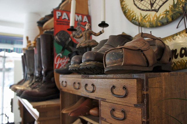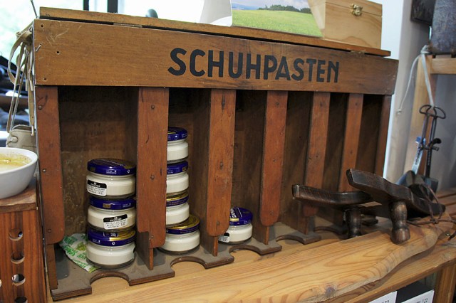 Federkielbestickte Hochzeitsschuhe und hochschaftige Bilgeri-Stiefel aus der k.u.k.-Monarchie stehen auf alten Schuhputzkastln, „aber die verkaufen wir nicht“, betont Dorit Hain lachend. Stattdessen fertigt ihr Mann Siegfried in der Kellerwerkstätte maßgeschneiderte Lederschuhe an, die mit der richtigen Pflege eine ähnlich hohe Lebenserwartung wie das historische Schuhwerk haben. Bei einem Urlaub in Italien ist der gelernte Werkzeugmacher der Liebe zur Schusterei verfallen und hat sich das traditionelle Handwerk selbst beigebracht. Sein jahrzehntelang angeeignetes Fachwissen und seine Leidenschaft steckt er auch in die Reparatur von Schuhen aller Art. Absätze, Innenfutter, Fersenleder – „viele Leute wissen gar nicht, was man alles wieder richten kann“, sagt Hain. Statt Plastik kommt natürlich gegerbtes Leder oder hochwertiger Gummi zum Einsatz: „Das ist besser für die Umwelt. Außerdem erzählen viele Kunden, dass sie länger mit den aufgewerteten Schuhen gehen können.“ Dabei hilft auch die umfangreiche Auswahl an Schuhzubehör im Geschäft, das sich in den Regalen harmonisch zu fair gehandelten Geschenksartikeln und Modeaccessoires gesellt. „Wir halten es mit dem alten Indianersprichwort“, meint Dorit Hain: „Man soll bei all seinen Handlungen an die nächsten sieben Generationen denken.“